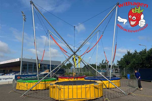 Deze topattractie is de blikvanger op ieder evenement en biedt urenlange fun aan iedereen. Je hoeft alleen een locatie van stroom te voorzien en wij regelen alles voor je. De bungee trampoline huur je altijd inclusief de deskundige begeleiding van Withagen-attractieverhuur. Wij zorgen tevens voor de dranghekken rond de bungee trampoline. Op deze manier kan er veilig worden gesprongen en hoef je je nergens druk om te maken. Naast de bungee trampoline kun je bij ons ook een multi trampoline huren waar met 6 kinderen tegelijk kan worden gesprongen. Op deze manier zorg je voor springplezier voor iedereen!