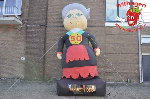 Vier een 50ste verjaardag in stijl met onze nieuwe, personaliseerbare en opblaasbare Sarah pop van Withagen Attractieverhuur! Deze opblaasbare Sarah pop, met een indrukwekkende hoogte van 4,80 meter, is een onmisbaar element voor elke verjaardag.